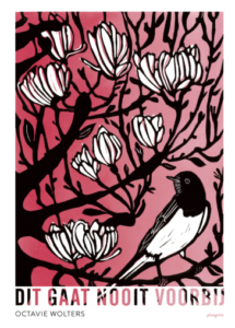 En tot slot is daar Dit gaat nooit voorbij, het laatste prentenboek (niet het laatst uitgegeven, maar het laatst door mij gelezen). Dit prentenboek wijkt af van de andere twee, door het gebruik van kleur en de paginavullende teksten. Elke maand heeft een illustratie van een vogel en een pagina tekst. Wolters vertelt over haar wandelingen door de natuur, over haar leven en over wat ze ziet. Ze heeft enorm veel aandacht voor detail en noemt ook de niet meteen opvallende elementen uit de natuur, zoals een omgevallen boom, een beekje, een bloempje, een waterpoeltje. September had me in tranen, als Wolters vertelt over haar overleden kindje. De fantastische lino's kun je ook los aanschaffen in de webshop van Octavie Wolters.